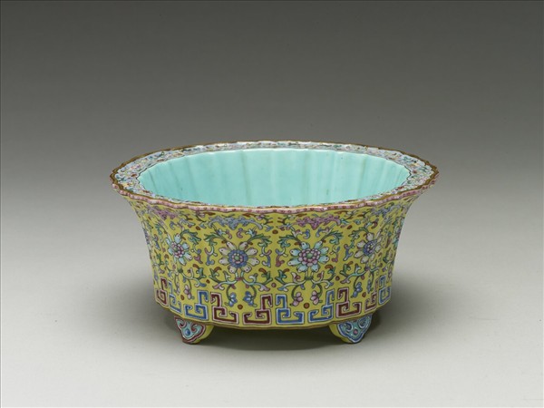 盆與托(故瓷1290),全器模製呈十二瓣蓮花型,撇口,斜壁坐於四雲頭足上。器內湖綠釉,器表檸檬黃,以紅、藍、綠等釉彩繪製纏枝番蓮、蝙蝠及變形磬紋,形成「福慶連連」的諧音意。器沿、支釘痕、器底及露胎的足底以金彩點畫,使全器達到滿釉的效果。造型精緻,色彩鮮亮。據原始編號為「菜」字顯示,這套盆托原收在紫禁城寧壽宮花園的遂初堂內。該宮殿建於清乾隆三十七年(1772),嘉慶、光緒年間重修。本套作品紋飾工整,然線條較不靈活,應屬乾隆晚期或嘉慶早期的作品。