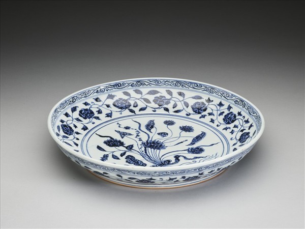 盤子弧壁,矮圈足。器底露胎,全器以青花為飾。口沿下飾卷草紋,內壁有蓮花、石榴、菊花等各式花朵共十三朵。外壁口沿下繪卷草紋,壁面畫纏枝花卉十四朵,近圈足處有回紋一周。盤心主紋飾是蓮花、慈菇等紮成的花束。因為外交往來以及貿易交換等因素,土耳其的托普卡普宮殿博物館以及伊朗的阿德卑爾神廟收藏有大量的十五世紀初期青花瓷器,類似這件作品的青花一把蓮盤,在兩大收藏中也都可以見到。