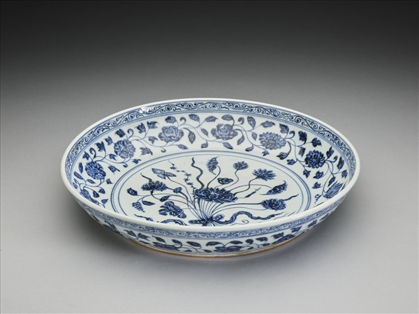 盤子弧壁,矮圈足。器底露胎,全器以青花為飾。口沿下飾卷草紋,內壁有蓮花、石榴、菊花等各式花朵共十三朵。外壁口沿下繪卷草紋,壁面畫纏枝花卉十四朵,近圈足處有回紋一周。盤心主紋飾是蓮花、慈菇等紮成的花束。因為外交往來以及貿易交換等因素,土耳其的托普卡普宮殿博物館以及伊朗的阿德卑爾神廟收藏有大量的十五世紀初期青花瓷器,類似這件作品的青花一把蓮盤,在兩大收藏中也都可以見到。