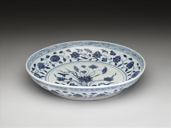 盤子弧壁,矮圈足。器底露胎,全器以青花為飾。口沿下飾卷草紋,內壁有蓮花、石榴、菊花等各式花朵共十三朵。外壁口沿下繪卷草紋,壁面畫纏枝花卉十四朵,近圈足處有回紋一周。盤心主紋飾是蓮花、慈菇等紮成的花束。因為外交往來以及貿易交換等因素,土耳其的托普卡普宮殿博物館以及伊朗的阿德卑爾神廟收藏有大量的十五世紀初期青花瓷器,類似這件作品的青花一把蓮盤,在兩大收藏中也都可以見到。