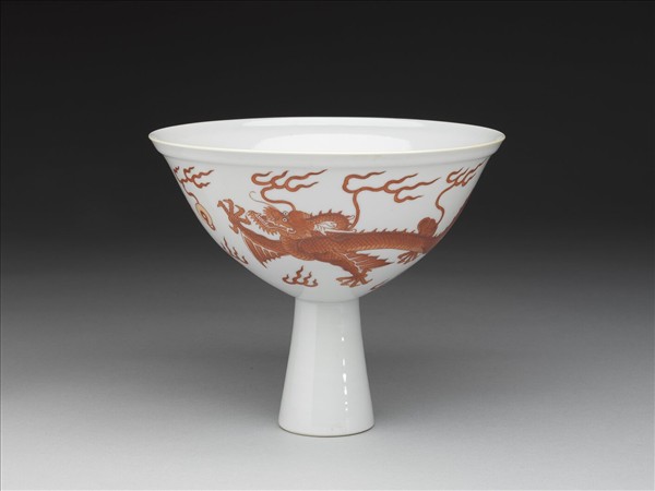 侈口窄唇,唇緣細稜凸起,深壁,高圈足,施白釉。外壁以紅彩描繪雙龍戲珠與火焰紋,碗心書「大清乾隆年製」三行六字篆款,外加雙方框。
