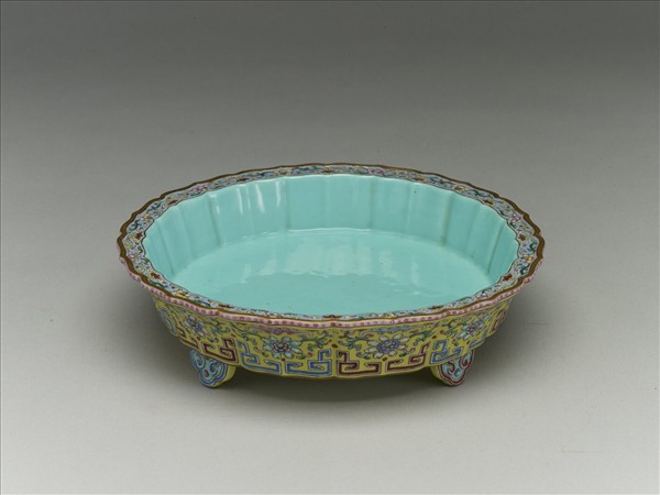 盆(故瓷1257)與托,全器模製呈十二瓣蓮花型,撇口,斜壁坐於四雲頭足上。器內湖綠釉,器表檸檬黃,以紅、藍、綠等釉彩繪製纏枝番蓮、蝙蝠及變形磬紋,形成「福慶連連」的諧音意。器沿、支釘痕、器底及露胎的足底以金彩點畫,使全器達到滿釉的效果。造型精緻,色彩鮮亮。據原始編號為「菜」字顯示,這套盆托原收在紫禁城寧壽宮花園的遂初堂內。該宮殿建於清乾隆三十七年(1772),嘉慶、光緒年間重修。本套作品紋飾工整,然線條較不靈活,應屬乾隆晚期或嘉慶早期的作品。
