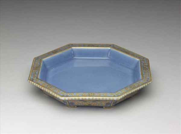 八方形盆(故瓷1261)與托配成套,敞口外折,窄唇,深直壁下斂,平底,坐於八個V型足上。施高溫天藍釉,釉表以低溫金、銀彩線繪轉枝番蓮、蝙蝠、編磬,形成「福慶連連」吉祥意涵的紋飾。銹成淡赭色的銀彩與金彩相輝映,在視覺上呈現深淺的立體效果,構思細膩,充滿皇室高尚、華麗的氣質。器底支釘痕,特以金彩點成梅花紋飾,藉以遮掩。此類支釘痕點彩的構思,為清乾隆晚期及嘉慶朝以來小型洋彩工藝的特色。露胎的足底又施金彩,盆心圓形滲水孔的孔壁亦掛青釉,使整套花器達滿釉不露胎的細膩設計。院藏尚有清代各式〈藍地粉彩描金瓷盆〉(中瓷03512、中瓷03696),華麗細緻,為皇室奢華花藝的表現。