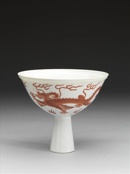 侈口窄唇,唇緣細稜凸起,深壁,高圈足,施白釉。外壁以紅彩描繪雙龍戲珠與火焰紋,碗心書「大清乾隆年製」三行六字篆款,外加雙方框。