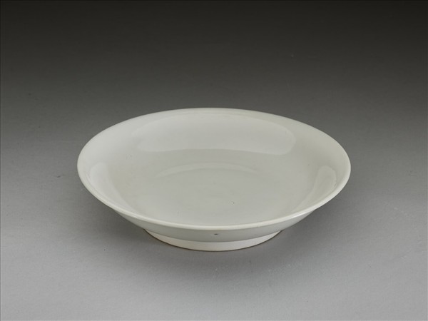 侈口窄唇,淺壁,矮圈足。胎質較薄,通體甜白釉,樸素無紋飾。底有青花書「大明宣德年製」二行六字楷款,外加雙圈。
