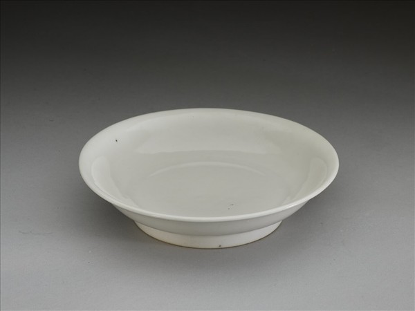 侈口窄唇,淺壁,矮圈足。胎質較薄,通體甜白釉,樸素無紋飾。底有青花書「大明宣德年製」二行六字楷款,外加雙圈。