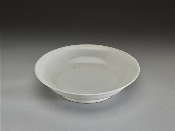 侈口窄唇,淺壁,矮圈足。胎質較薄,通體甜白釉,樸素無紋飾。底有青花書「大明宣德年製」二行六字楷款,外加雙圈。