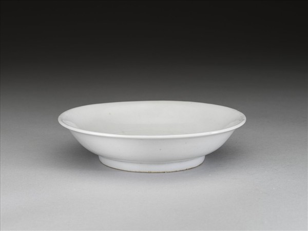 侈口窄唇,淺壁,矮圈足。胎質較薄,通體甜白釉,樸素無紋飾。底有青花書「大明宣德年製」二行六字楷款,外加雙圈。