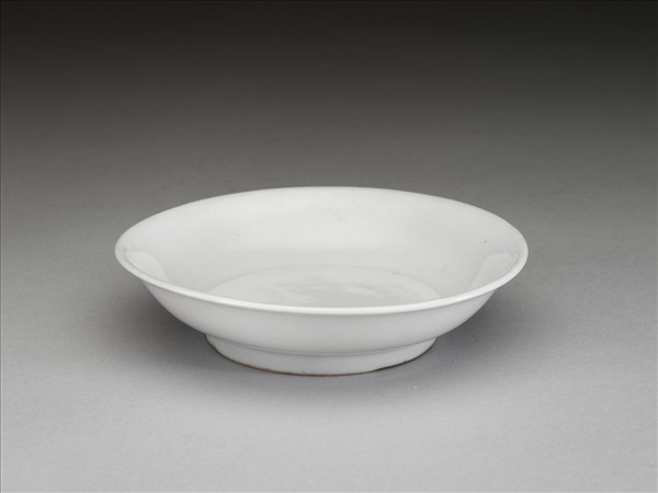 侈口窄唇,淺壁,矮圈足。胎質較薄,通體甜白釉,樸素無紋飾。底有青花書「大明宣德年製」二行六字楷款,外加雙圈。