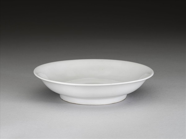 侈口窄唇,淺壁,矮圈足。胎質較薄,通體甜白釉,樸素無紋飾。底有青花書「大明宣德年製」二行六字楷款,外加雙圈。