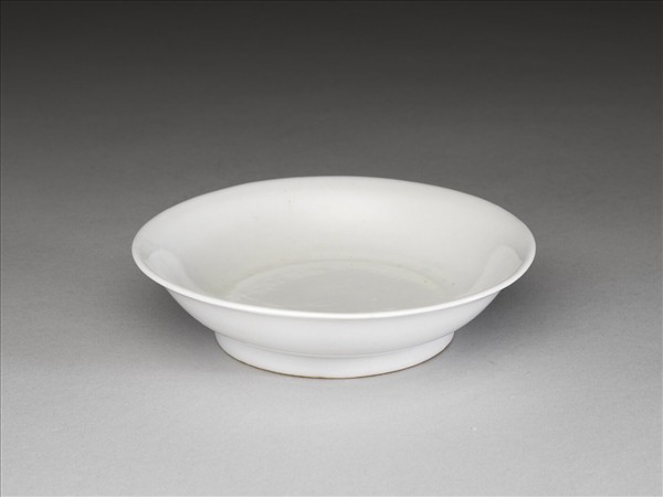 侈口窄唇,淺壁,矮圈足。胎質較薄,通體甜白釉,樸素無紋飾。底有青花書「大明宣德年製」二行六字楷款,外加雙圈。