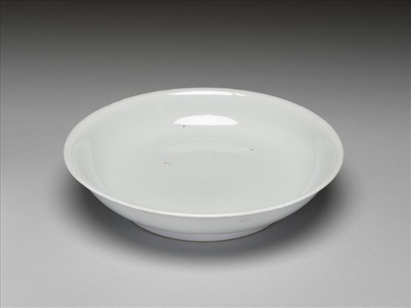 侈口窄唇,淺壁,矮圈足。胎質較厚,釉色甜白,樸素無紋飾。