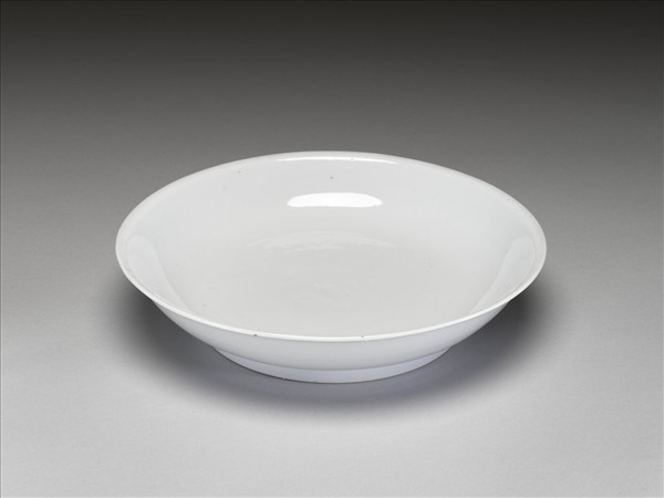 侈口窄唇,淺壁,矮圈足。胎質較厚,釉色甜白,樸素無紋飾。