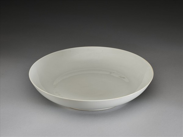 侈口,淺壁,矮圈足。釉色甜白,樸素無紋飾。底有青花書「大明弘治年製」二行六字楷款,外加雙圈。
