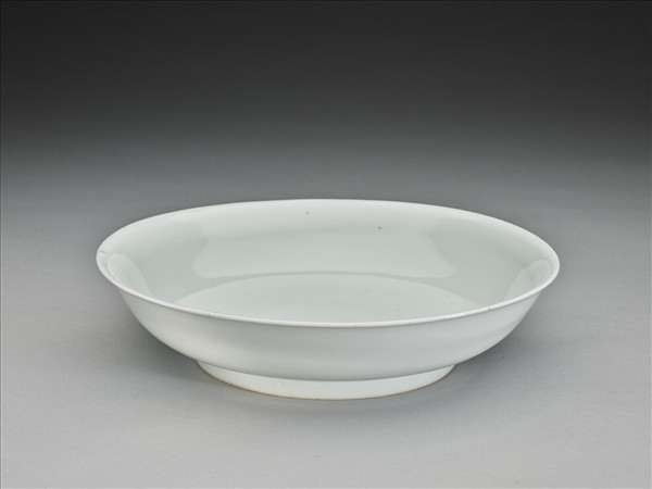 侈口窄唇,淺壁,矮圈足。胎質較厚,釉色甜白,樸素無紋飾。