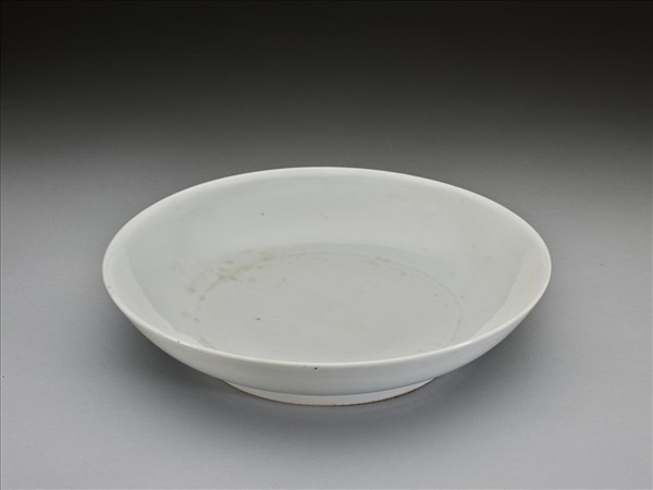 侈口窄唇,淺壁,矮圈足。胎質較厚,釉色甜白,樸素無紋飾。