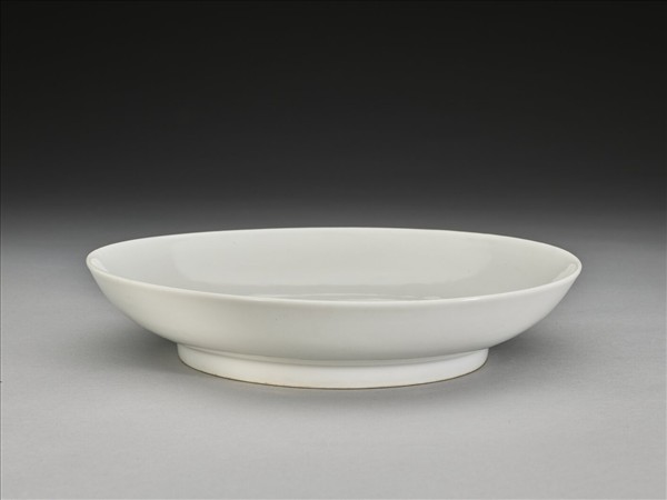 侈口窄唇,淺壁,矮圈足。胎質較厚,釉色甜白,樸素無紋飾。