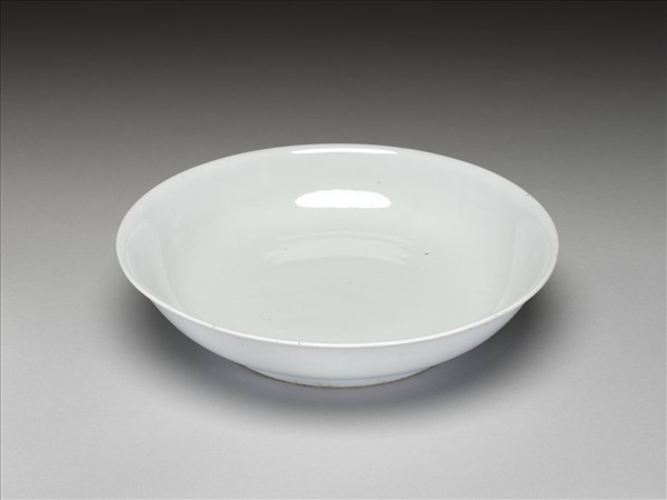侈口窄唇,淺壁,矮圈足。胎質較厚,釉色甜白,樸素無紋飾。