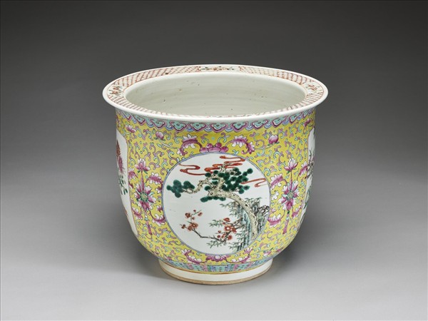 粉彩黃地開光四季花卉紋盆