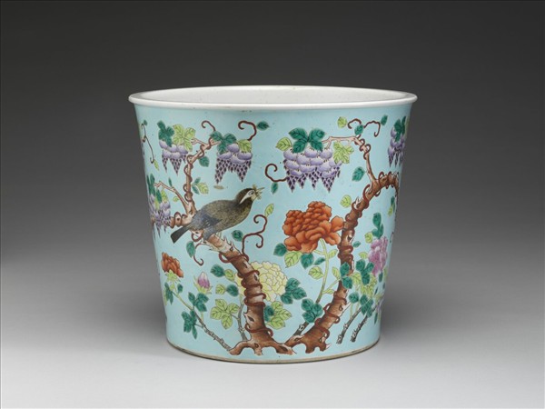 粉彩藍地紫藤花鳥紋花盆