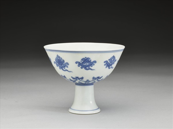 侈口,深壁,高圈足,足底外撇。外壁以青花繪八寶紋,底沿有幾何花卉紋一周,口沿至足底共五道青線,內壁光素無紋。圈足露胎,足內以青花書「大清雍正年製」一行六字楷款。