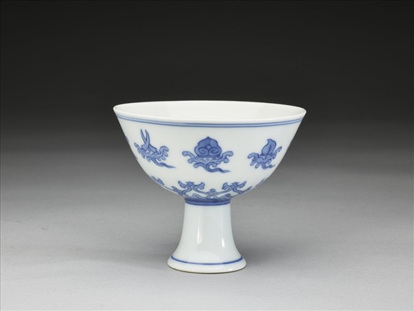 侈口,深壁,高圈足,足底外撇。外壁以青花繪八寶紋,底沿有幾何花卉紋一周,口沿至足底共五道青線,內壁光素無紋。圈足露胎,足內以青花書「大清雍正年製」一行六字楷款。
