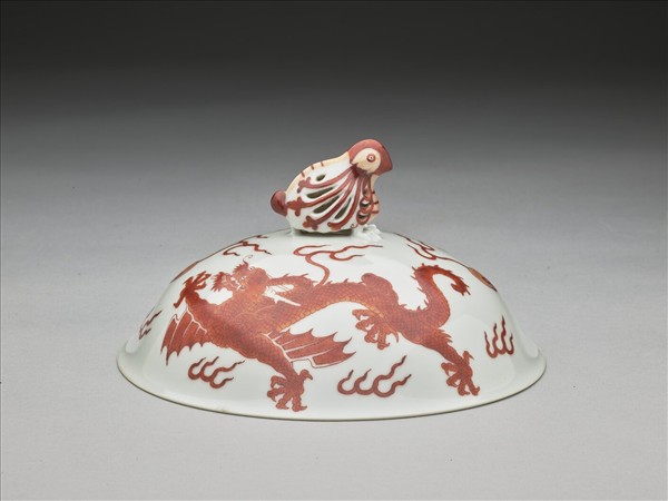 高足碗蓋,侈口窄唇,深壁,頂飾一鏤空鳥形蓋鈕。外壁飾紅彩描繪的雙龍戲珠與火焰紋,鳥形蓋鈕上亦繪有紅彩。蓋心書「大清乾隆年製」三行六字篆款,外加雙方框。