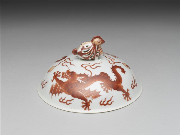 高足碗蓋,侈口窄唇,深壁,頂飾一鏤空鳥形蓋鈕。外壁飾紅彩描繪的雙龍戲珠與火焰紋,鳥形蓋鈕上亦繪有紅彩。蓋心書「大清乾隆年製」三行六字篆款,外加雙方框。