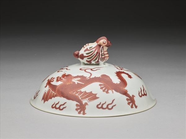 高足碗蓋,侈口窄唇,深壁,頂飾一鏤空鳥形蓋鈕。外壁飾紅彩描繪的雙龍戲珠與火焰紋,鳥形蓋鈕上亦繪有紅彩。蓋心書「大清乾隆年製」三行六字篆款,外加雙方框。