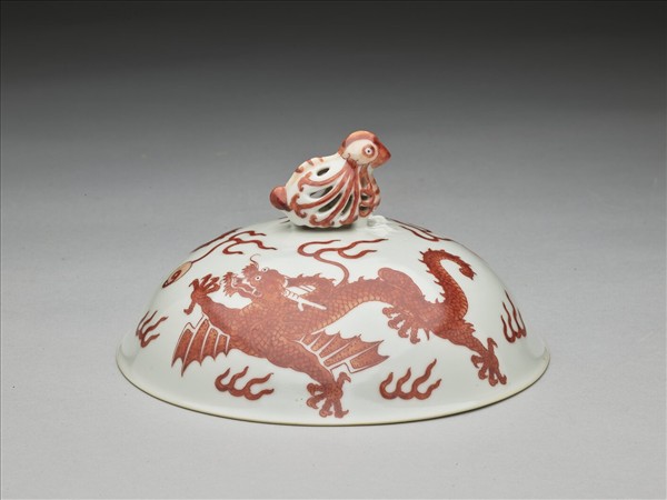 高足碗蓋,侈口窄唇,深壁,頂飾一鏤空鳥形蓋鈕。外壁飾紅彩描繪的雙龍戲珠與火焰紋,鳥形蓋鈕上亦繪有紅彩。蓋心書「大清乾隆年製」三行六字篆款,外加雙方框。