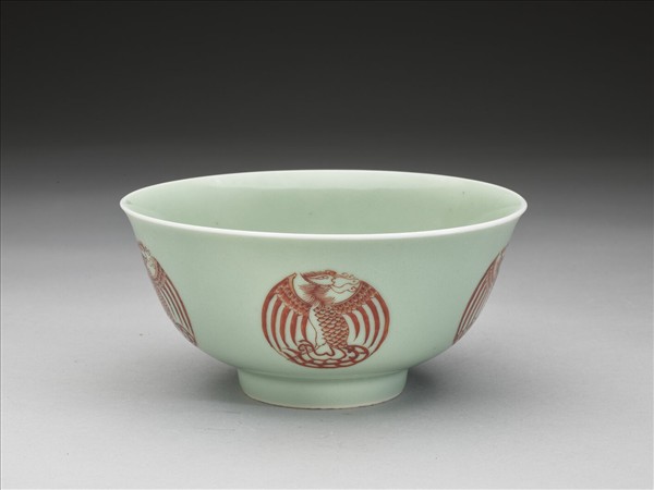 圓口,唇緣微外侈,弧形深壁,平底,矮圈足。器壁通施冬青釉,釉色呈粉綠。外壁裝飾五個描紅團鳳紋,碗心亦繪一團鳳紋,鳳首、軀體與鳳尾成S型,雙翅展開於兩側,使圖案成圓形,線條粗細分明。底有青花書「大清雍正年製」二行六字楷款,外加雙圈。