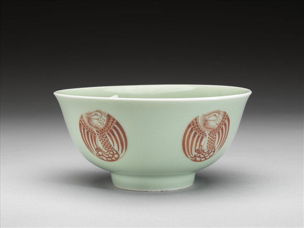 圓口,唇緣微外侈,弧形深壁,平底,矮圈足。器壁通施冬青釉,釉色呈粉綠。外壁裝飾五個描紅團鳳紋,碗心亦繪一團鳳紋,鳳首、軀體與鳳尾成S型,雙翅展開於兩側,使圖案成圓形,線條粗細分明。底有青花書「大清雍正年製」二行六字楷款,外加雙圈。