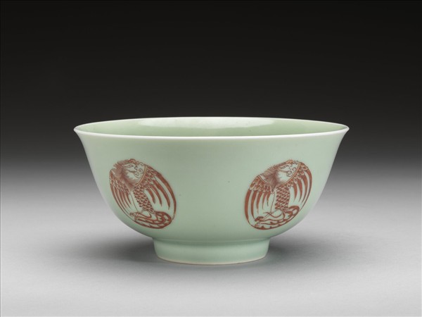 圓口,唇緣微外侈,弧形深壁,平底,矮圈足。器壁通施冬青釉,釉色呈粉綠。外壁裝飾五個描紅團鳳紋,碗心亦繪一團鳳紋,鳳首、軀體與鳳尾成S型,雙翅展開於兩側,使圖案成圓形,線條粗細分明。底有青花書「大清雍正年製」二行六字楷款,外加雙圈。