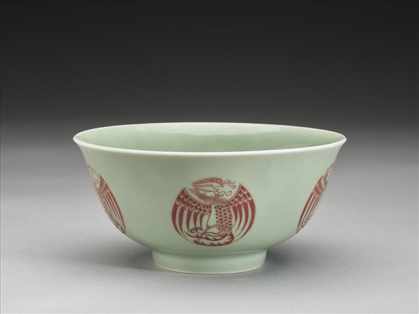 圓口,唇緣微外侈,弧形深壁,平底,矮圈足。器壁通施冬青釉,釉色呈粉綠。外壁裝飾五個描紅團鳳紋,碗心亦繪一團鳳紋,鳳首、軀體與鳳尾成S型,雙翅展開於兩側,使圖案成圓形,線條粗細分明。底有青花書「大清雍正年製」二行六字楷款,外加雙圈。