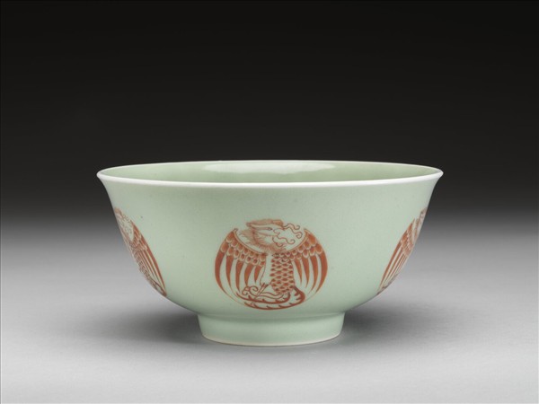 冬青釉描紅團鳳紋碗