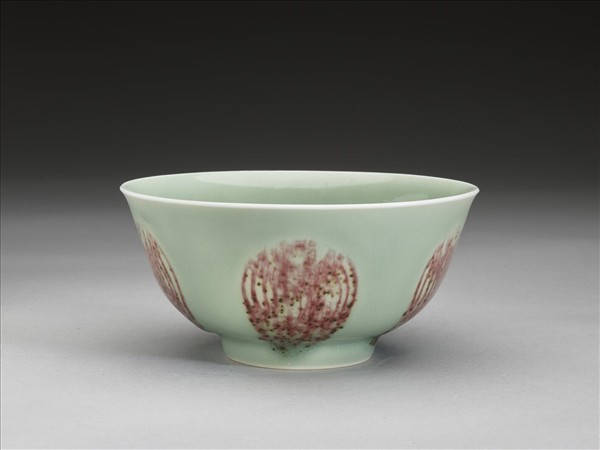 圓口,唇緣微外侈,弧形深壁,平底,矮圈足。器壁通施冬青釉,釉色呈粉綠。外壁裝飾五個紅彩團鳳紋,碗心亦繪一團鳳紋,鳳首、軀體與鳳尾成S型,雙翅展開於兩側,使圖案成圓形,紅彩發色呈暗紅色,帶深綠色苔點,可能因流動造成色料暈散,圖案模糊不清。底有青花書「大清雍正年製」二行六字楷款,外加雙圈。