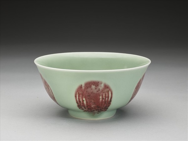 圓口,唇緣微外侈,弧形深壁,平底,矮圈足。器壁通施冬青釉,釉色呈粉綠。外壁裝飾五個紅彩團鳳紋,碗心亦繪一團鳳紋,鳳首、軀體與鳳尾成S型,雙翅展開於兩側,使圖案成圓形,紅彩發色呈暗紅色,帶深綠色苔點,可能因流動造成色料暈散,圖案模糊不清。底有青花書「大清雍正年製」二行六字楷款,外加雙圈。