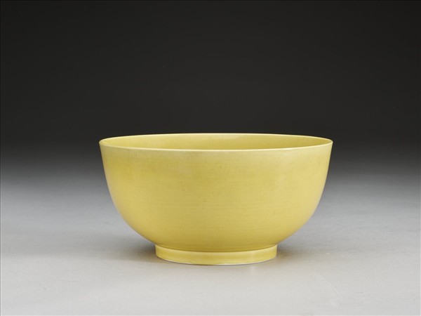 斂口,深弧壁,矮圈足。全器內外壁均施黃釉,釉色濃艷明亮。外壁施釉至足際,足圈露胎,圈足內底施白釉,並書「大清康熙年製」六字雙圈青花楷書款。