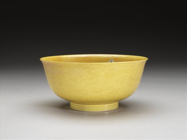 微撇口,深弧壁,矮圈足。全器內外壁均施黃釉,外壁施釉至足際。碗心飾劃花龍紋,外壁刻劃龍鳳紋,底邊則為蓮瓣紋。足圈露胎,圈足內底施白釉,並書「大清康熙年製」六字雙行雙圈青花楷書款。
