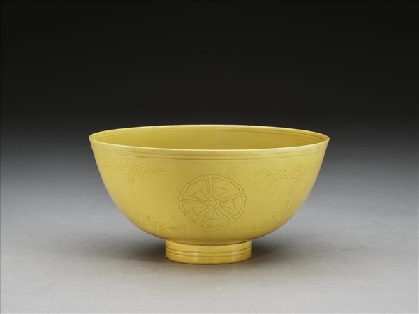 微撇口,深弧壁,矮圈足。全器內外壁均施黃釉,外壁施釉至足際。碗心刻畫一團花紋,外有雙圈。外壁飾四團花紋與十字雲紋,底邊則飾變形蕉葉紋。口沿與圈足各飾兩道弦紋。足圈露胎,圈足內底施白釉,並書「大清康熙年製」六字雙行雙圈青花楷書款。