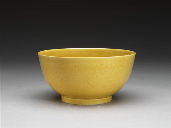 斂口,深弧壁,矮圈足。全器內外壁施淺黃釉,外壁飾劃穿花行龍紋,圈足旁飾海水江牙。足底露胎,圈足內底施白釉青花「大清道光年製」篆款。