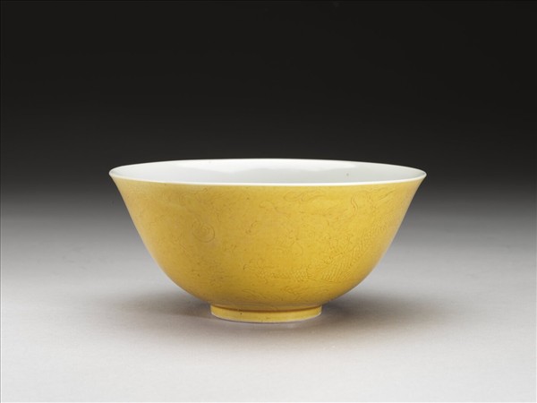 微撇口,深弧壁,矮圈足。全器外壁施黃釉,飾劃穿花行龍紋,圈足旁飾海水江牙,內壁施白釉。足圈露胎,圈足內底施白釉,並書「大清道光年製」六字三行青花篆款。