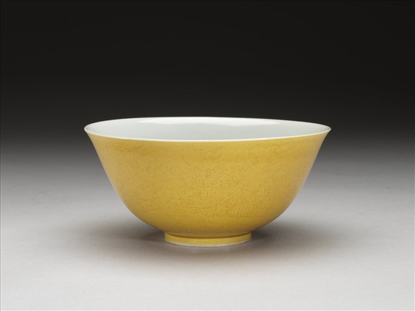 微撇口,深弧壁,矮圈足。全器外壁施黃釉,飾劃穿花行龍紋,圈足旁飾海水江牙,內壁施白釉。足圈露胎,圈足內底施白釉,並書「大清道光年製」六字三行青花篆款。
