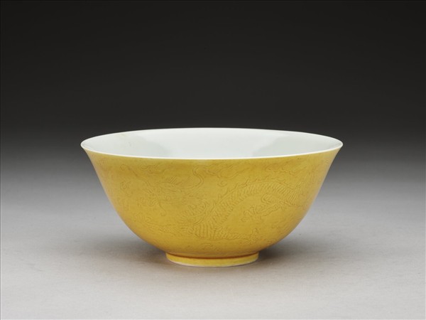 微撇口,深弧壁,矮圈足。全器外壁施黃釉,飾劃穿花行龍紋,圈足旁飾海水江牙,內壁施白釉。足圈露胎,圈足內底施白釉,並書「大清道光年製」六字三行青花篆款。