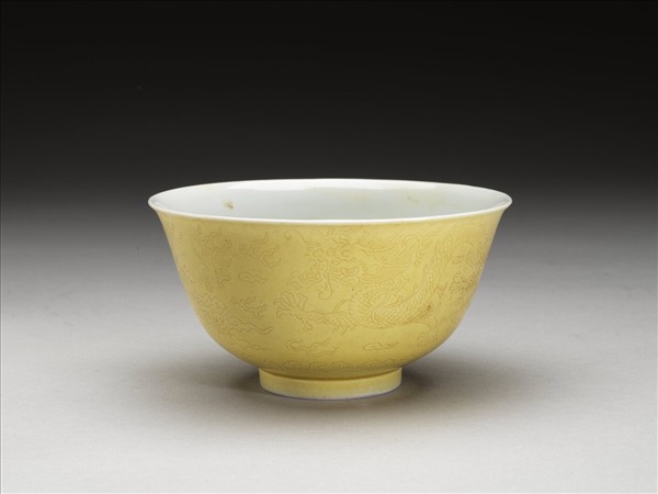 微撇口,深弧壁,矮圈足。全器外壁施黃釉,飾劃穿花行龍紋,圈足旁飾海水江牙,內壁施白釉。足圈露胎,圈足內底施白釉,並書「大清道光年製」六字三行青花篆款。