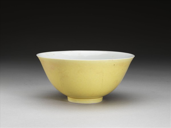 微撇口,深弧壁,矮圈足。全器外壁施黃釉,內壁施白釉。足圈露胎,圈足內底施白釉,並書「大清道光年製」六字三行青花篆款。