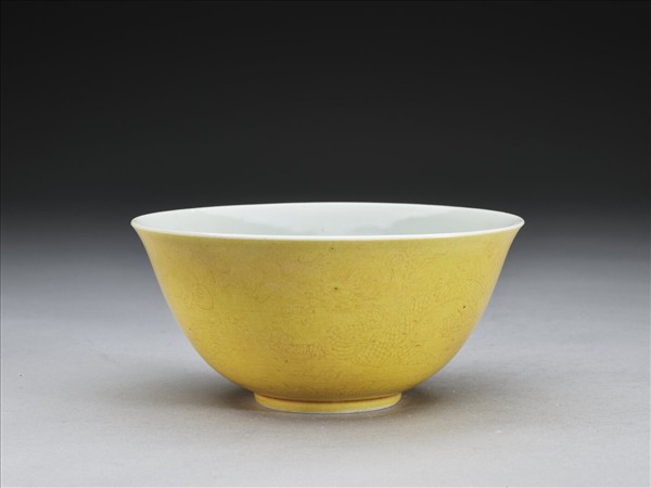 微撇口,深弧壁,矮圈足。全器外壁施黃釉,飾劃穿花行龍紋,圈足旁飾海水江牙,內壁施白釉。足圈露胎,圈足內底施白釉,並書「大清道光年製」六字三行青花篆款。