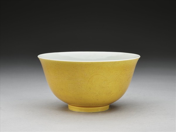 微撇口,深弧壁,矮圈足。全器外壁施黃釉,飾劃穿花行龍紋,圈足旁飾海水江牙,內壁施白釉。足圈露胎,圈足內底施白釉,並書「大清道光年製」六字三行青花篆款。