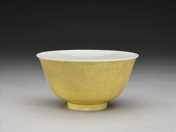 微撇口,深弧壁,矮圈足。全器外壁施黃釉,飾劃穿花行龍紋,圈足旁飾海水江牙,內壁施白釉。足圈露胎,圈足內底施白釉,並書「大清道光年製」六字三行青花篆款。