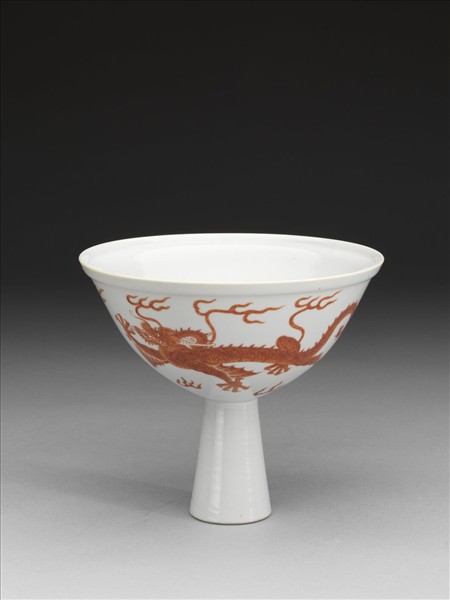 侈口窄唇,唇緣細稜凸起,深壁,高圈足,施白釉。外壁以紅彩描繪雙龍戲珠與火焰紋,碗心書「大清乾隆年製」三行六字篆款,外加雙方框。